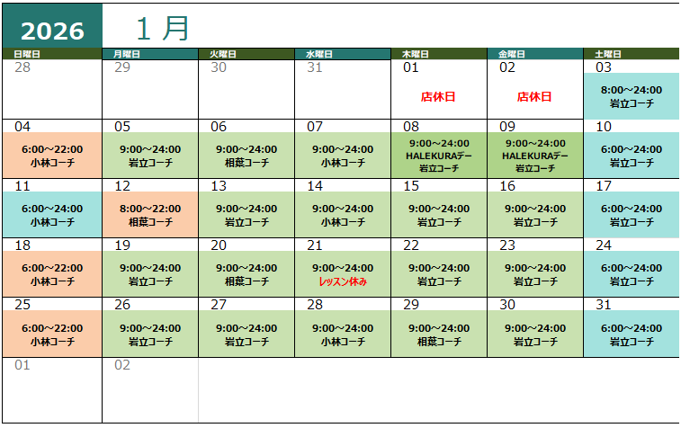 お知らせ詳細 2026.01.01(木) 2026年1月 営業時間&レッスンに関するお知らせ 2026年1月の営業時間&レッスンスケジュールのお知らせです。 ~レッスンお休み~ 1月1日(木) 1月2日(金) 1月21日(水) 正会員一時募集停止のお知らせ 一覧を見る