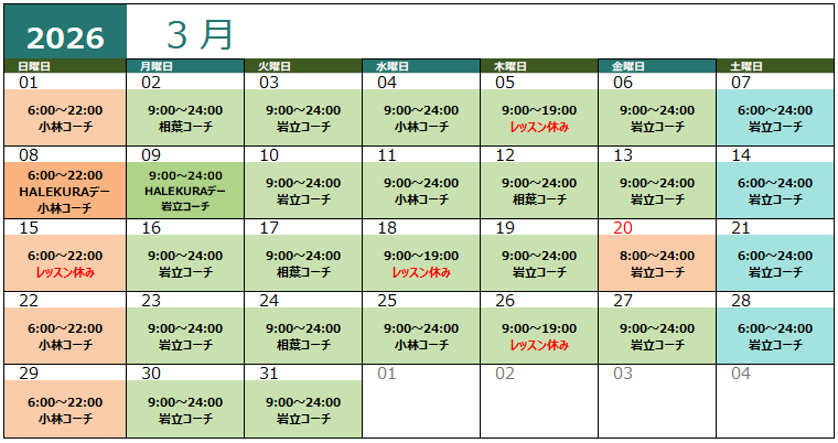 お知らせ詳細 2026.03.01(日) 2026年3月 営業時間&レッスンに関するお知らせ 2026年3月の営業時間&レッスンスケジュールのお知らせです。 ~レッスンお休み~ 3月5日(木) 3月15日(日) 3月18日(水) 3月26日(木) 【大切なお知らせ】月会費改定について 一覧を見る